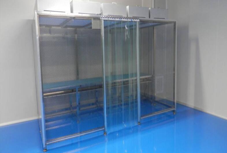 潔凈層流罩FFU及高效過濾器放置在由放在不銹網(wǎng)支架支撐棚架的托框上。頂部由盲板鋪蓋,密縫嚴密,四周用防靜電簾圍縫,四周底部利用正壓自然排風等形式,使?jié)崈襞飬^(qū)內潔凈度達到1000級。潔凈棚其具有安裝快速、施工周期短、價格低廉、移動方便等特點,,如流水線作業(yè)區(qū)域,高精確度產(chǎn)品組裝區(qū)。